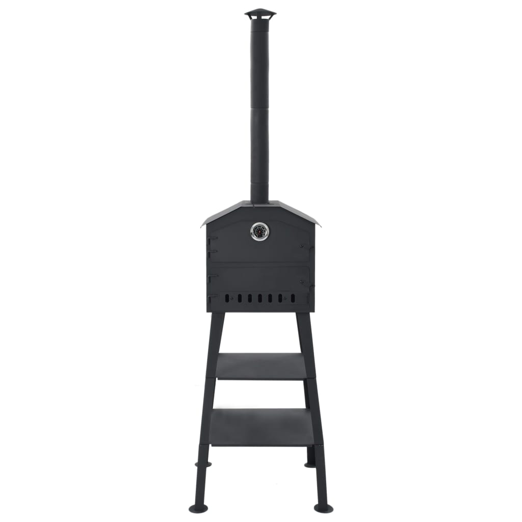 This standalone oven is suitable for all types of charcoal. The fire tray is removable, allowing for quick and easy cleaning. The top compartment is used for baking and its base is made of two refractory ('fireclay') bricks, which distribute the heat evenly within the oven and can withstand temperatures of up to 2372 °F. The bricks also ensure that your food will not be soiled by flying ash or dust from the fire. The two shelves provided underneath the oven are practical to store oven gloves or other supplies. This oven also comes with a built-in thermometer.